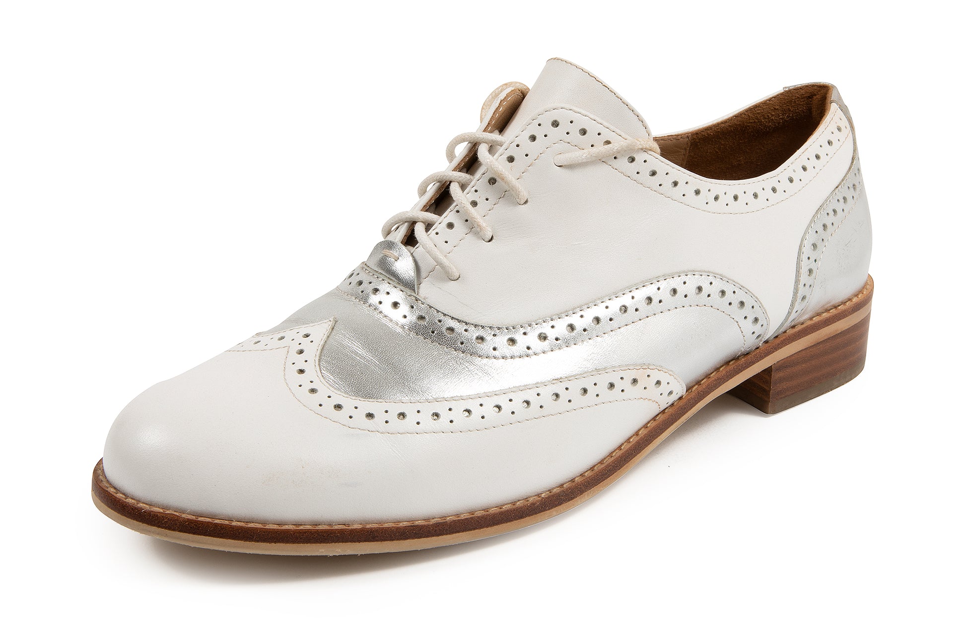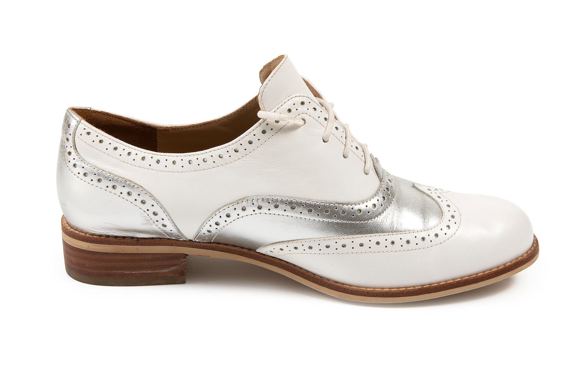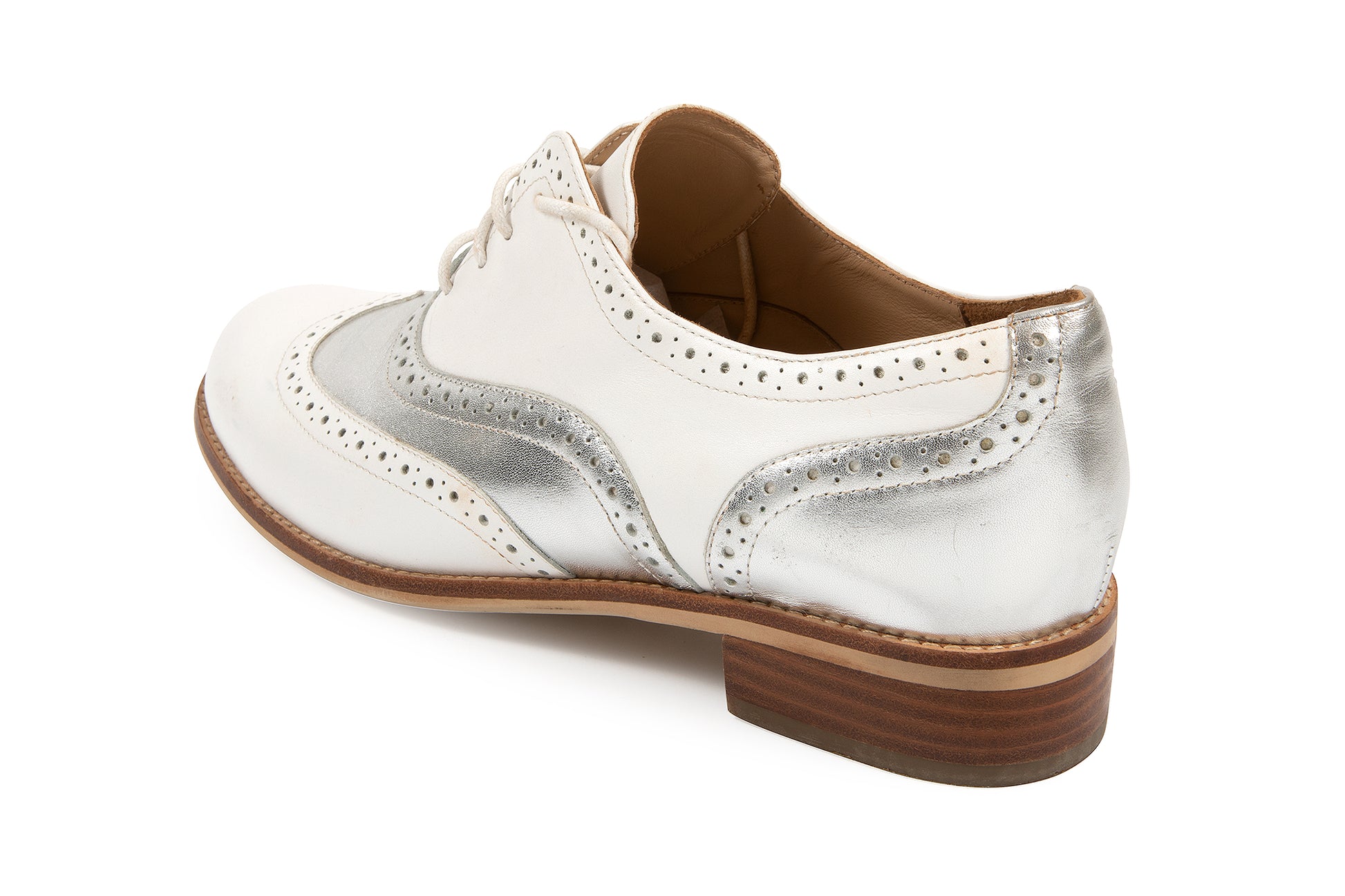 Upper - Two tone white & silver leather. Kid skin lining. Very soft feel on your foot.