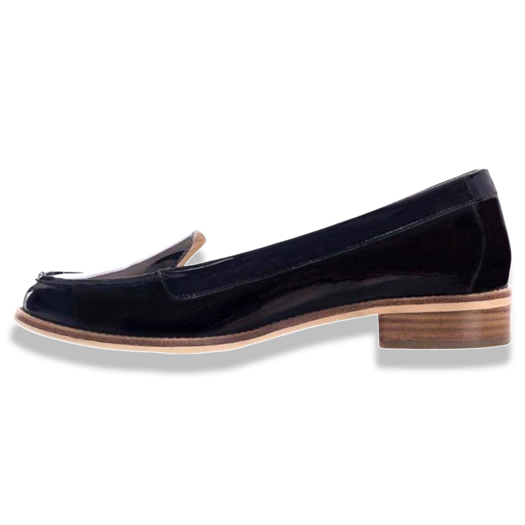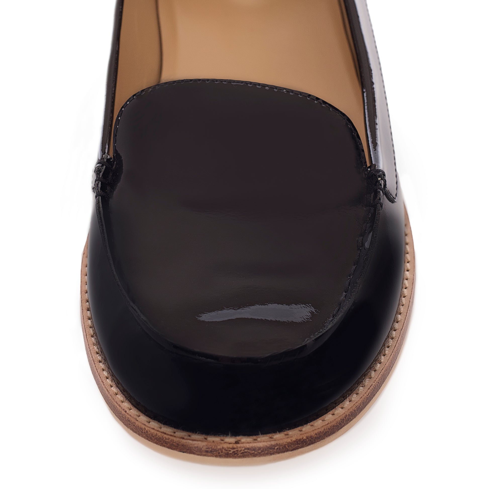 Upper - Black patent. Hand-stitched. Kid skin lining.